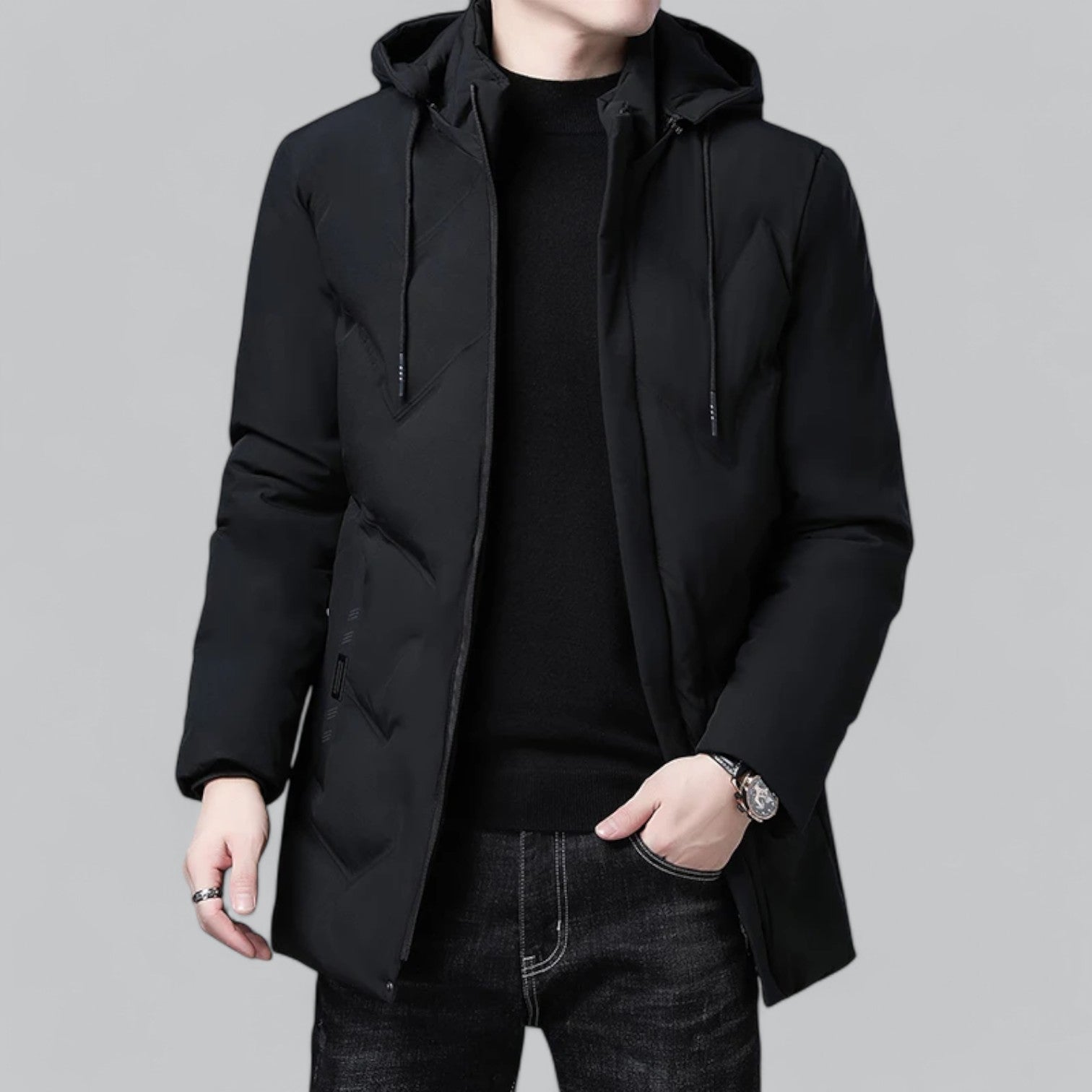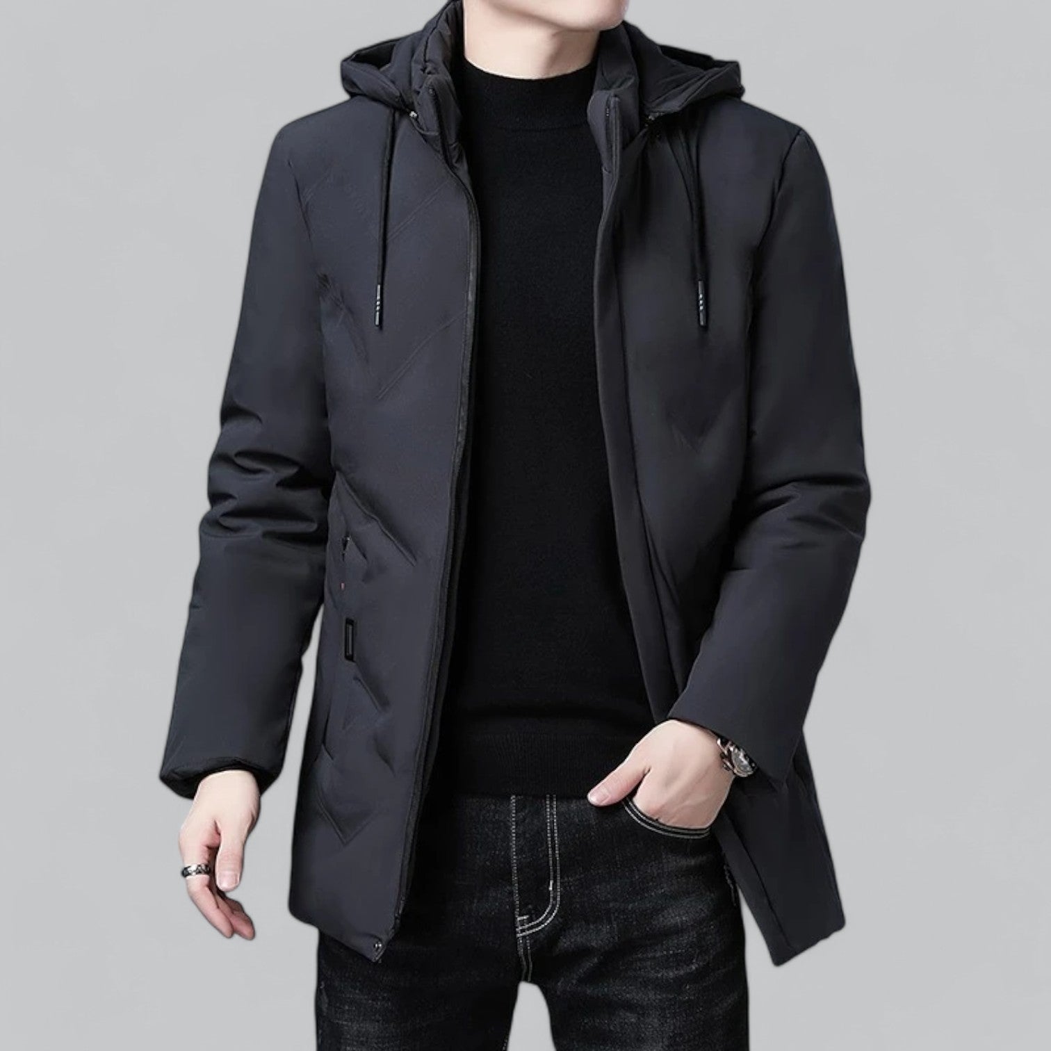 This fashionable hooded winter jacket for men combines style and functionality in one. The sleek design and practical hood make this jacket an excellent choice for the cold season, while the modern look makes it a versatile addition to your winter wardrobe.