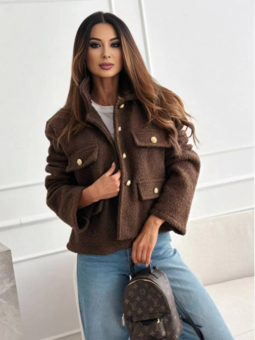 Women's Coat – Relaxed Fit – Plush Texture – Metallic Buttons – Flap Pockets