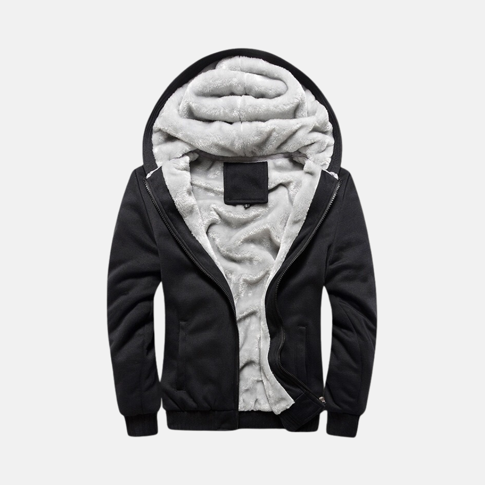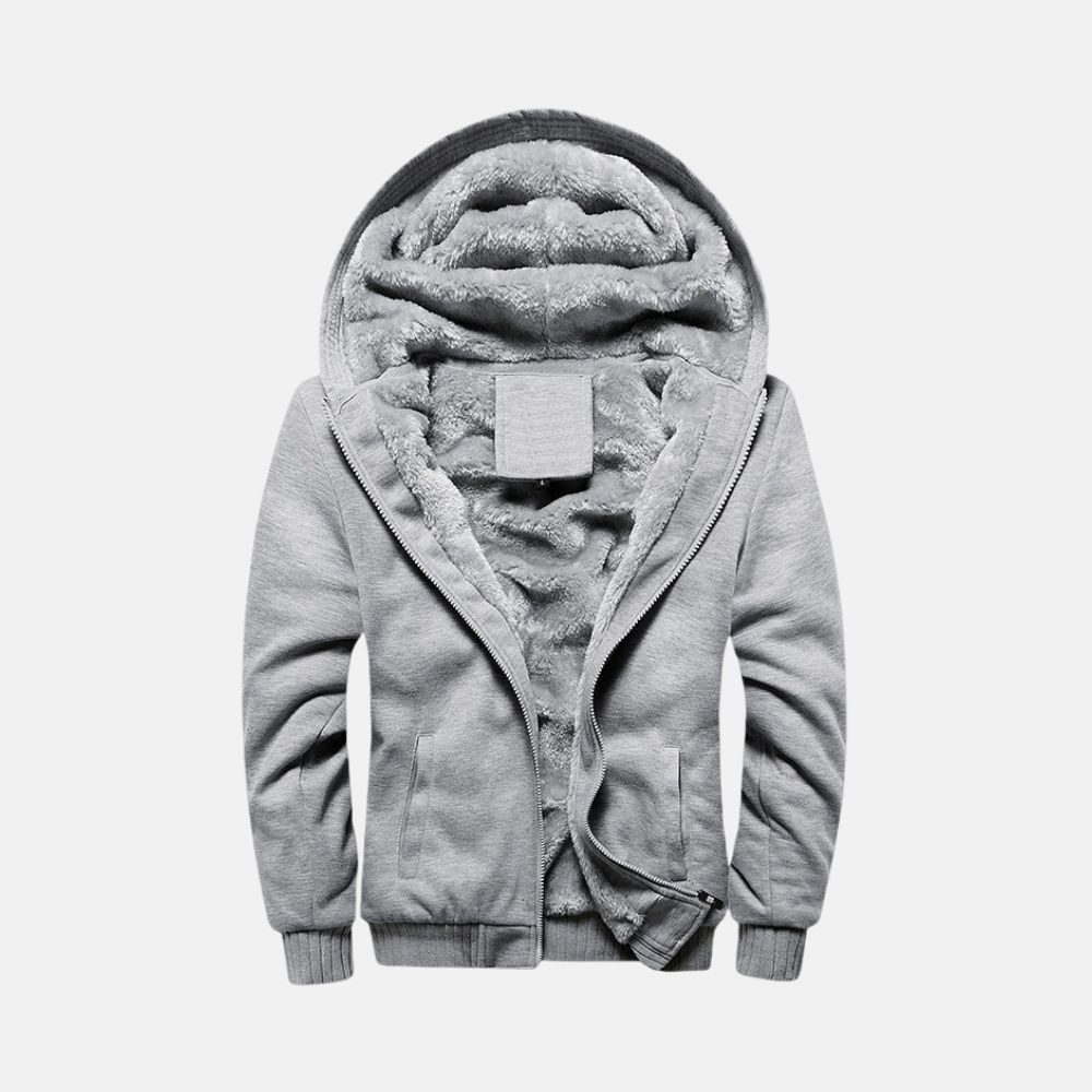 This men's hooded jacket is made from knitted fabric and features a relaxed fit. The jacket has a hood and ribbed trims, and is fully lined with plush fleece for extra warmth.