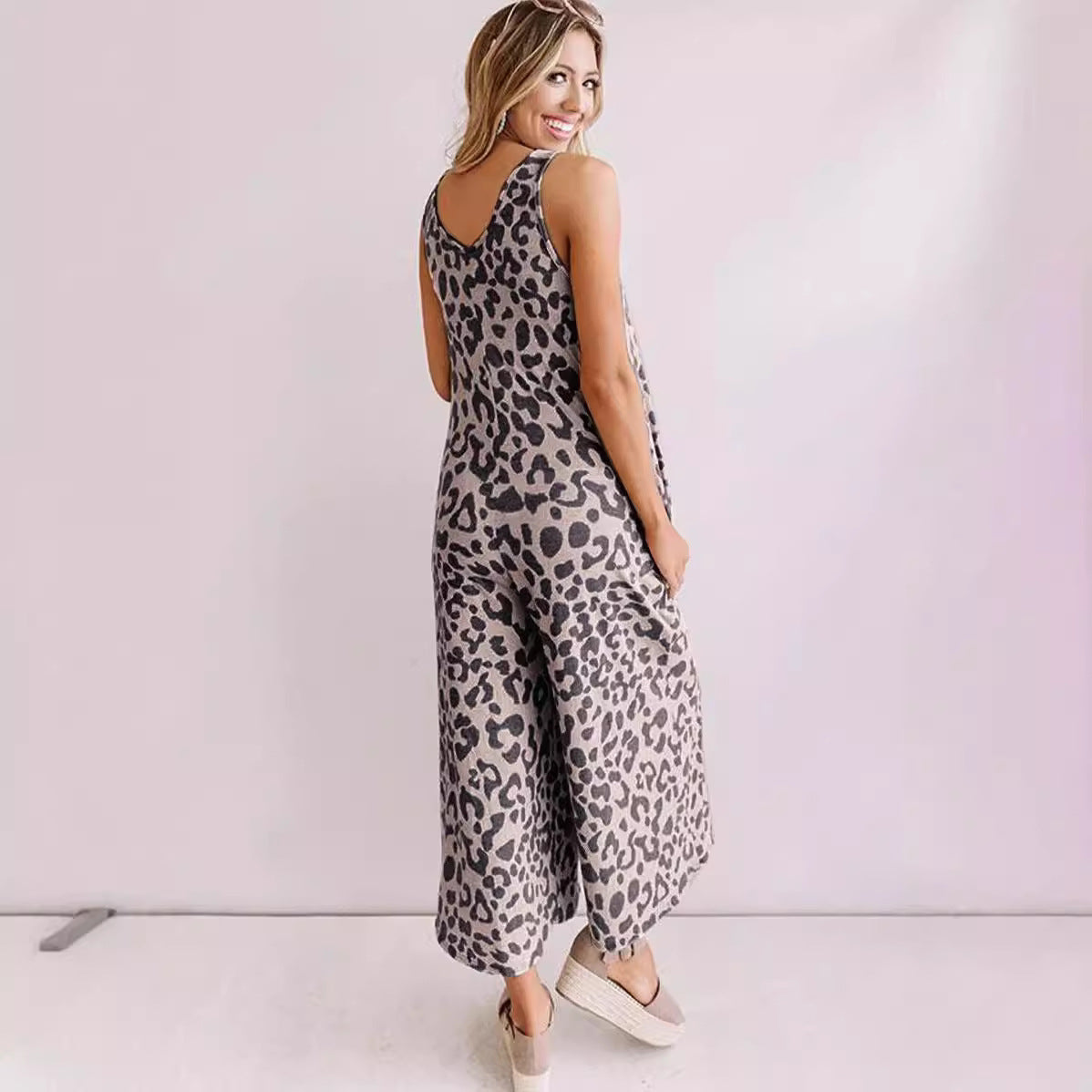 Ladies jumpsuit – Sleeveless – Leopard print – V-neck – Loose fit – Cropped wide model