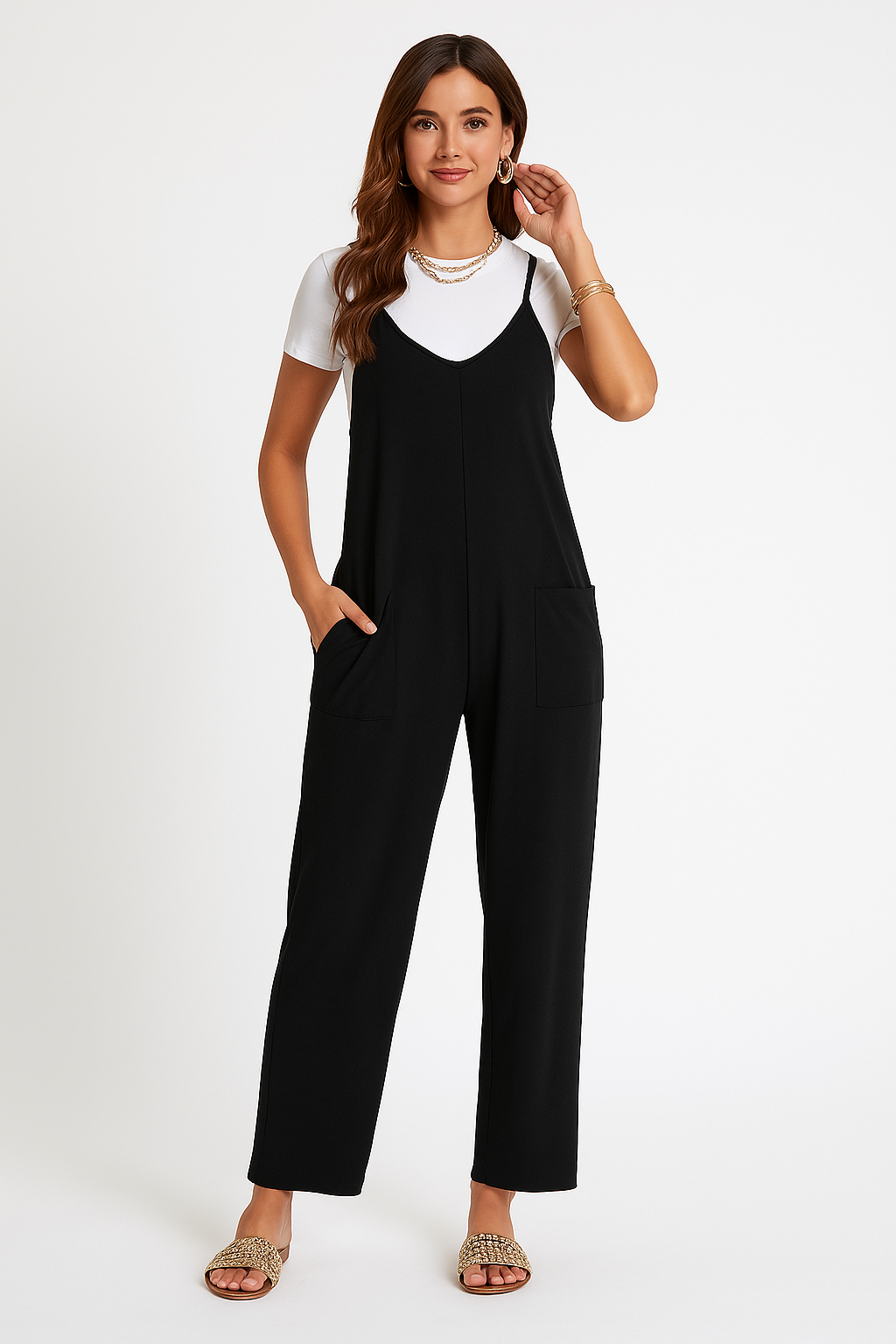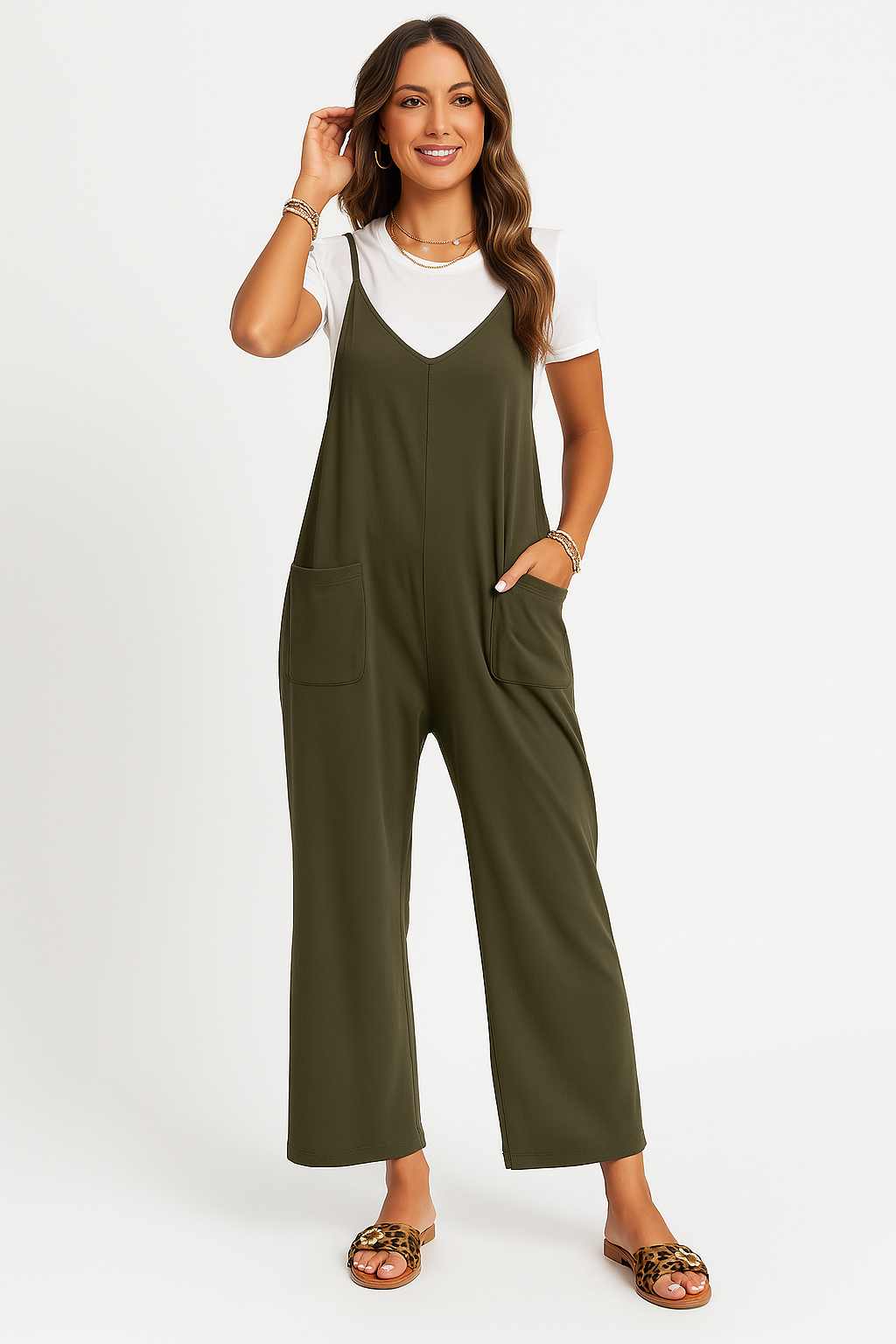 Women's jumpsuit – Loose fit – Adjustable straps – V-neck – Breathable fabric – Waist tie