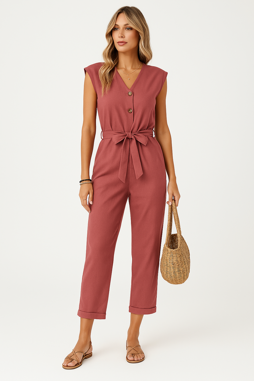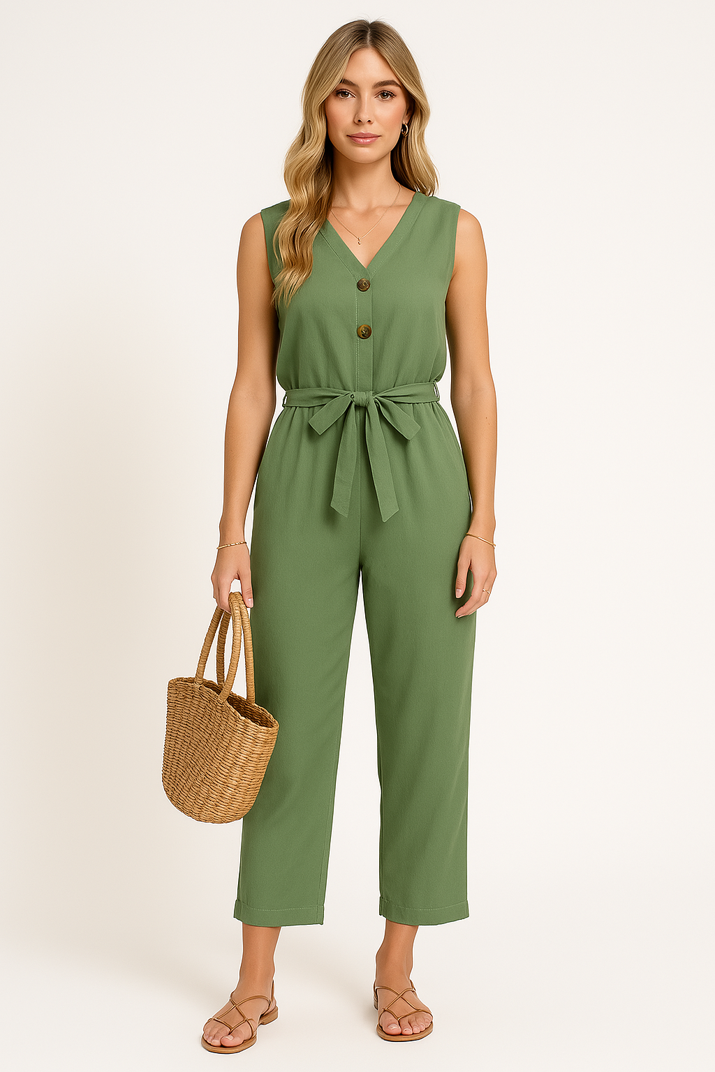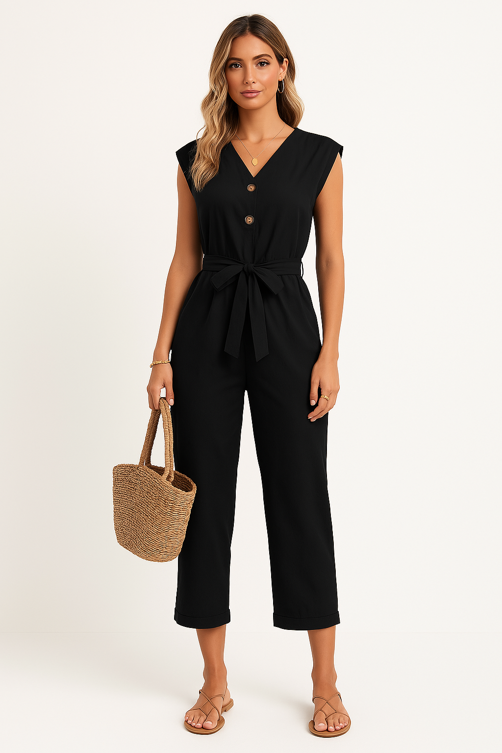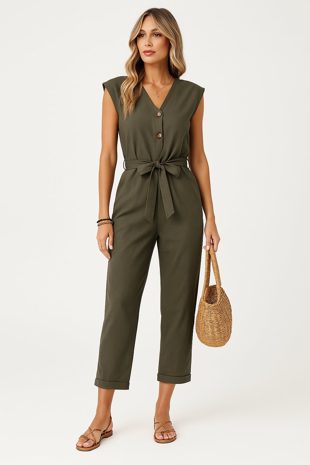 Women's Jumpsuit – V-neck – Sleeveless – Relaxed Fit – Button Closure – Waist Tie
